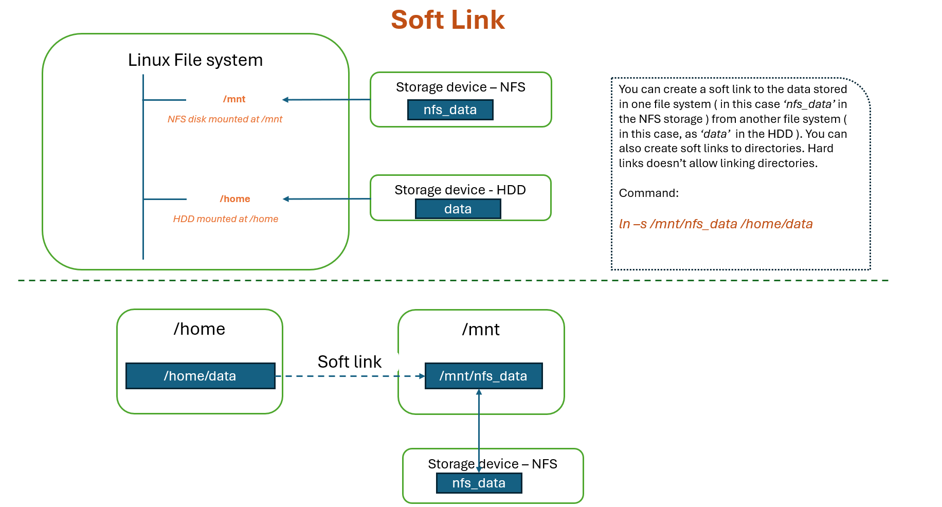 A soft link is like a shortcut that points to the original file.